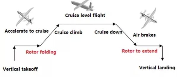 (a) Vertical take-off: the rotor is deployed, and the motor-driven rotor takes off vertically to a safe height, and the vertical ascent height is generally 20-50 meters; .
